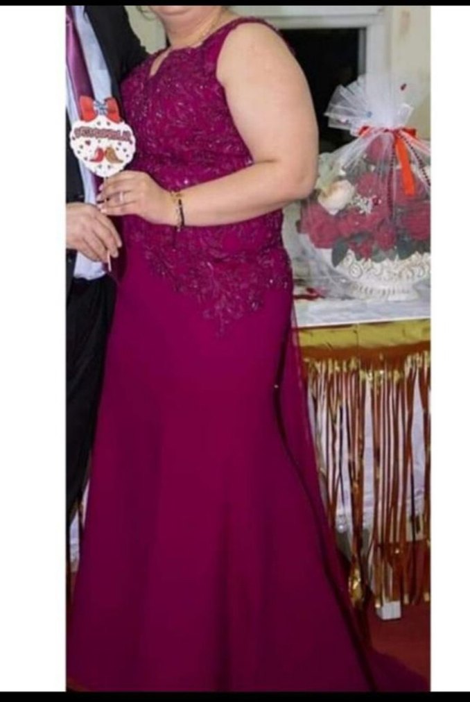 mürdüm renkte, dantel işlemeli, V yakalı, kolsuz ve vücuda oturan uzun abiye elbise. Modern klasik tarzda şık bir seçim.