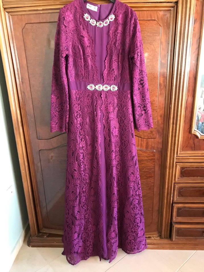 Mürdüm renk, yaka ve bel kısmı taşlı, içi düz renk dış kısmı dantelli abiye elbise. Kına gecesi içinde uygundur. Rengi resimdekinden daha canlıdır