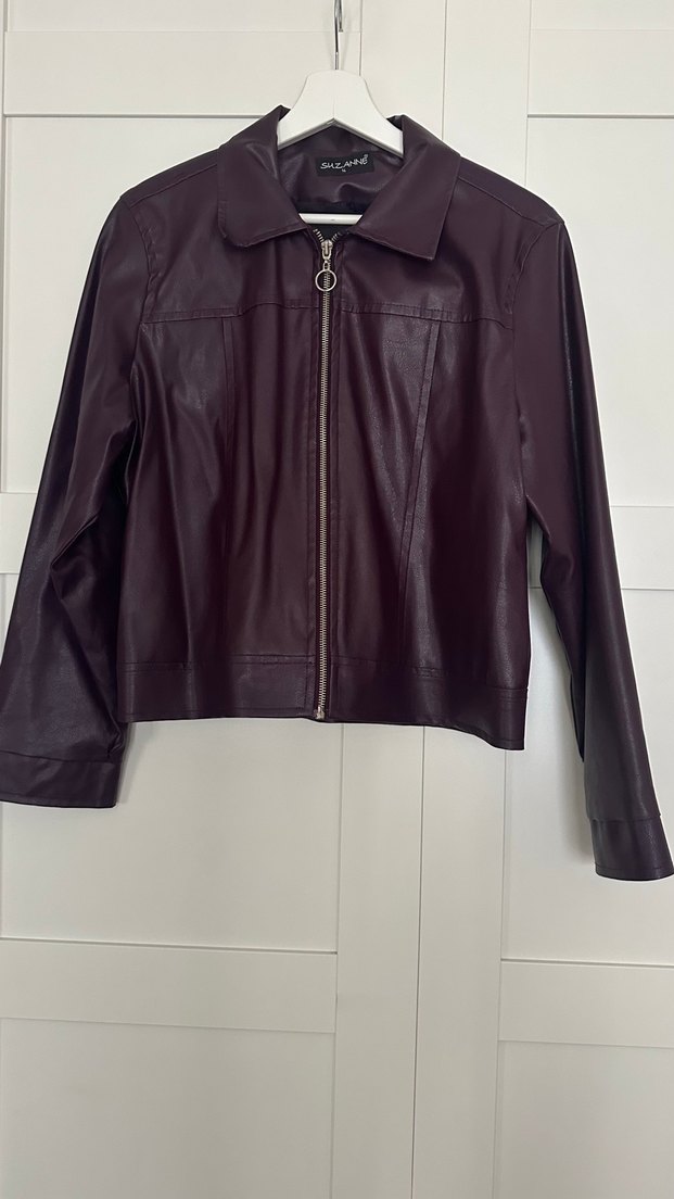 Mürdüm renkli, fermuarlı, uzun kollu ve yakalı deri kadın ceketi. Şık ve fit kesim, ofis için uygun biker tarzı.iç astarda sökülme vardır görsele eklenmiştir