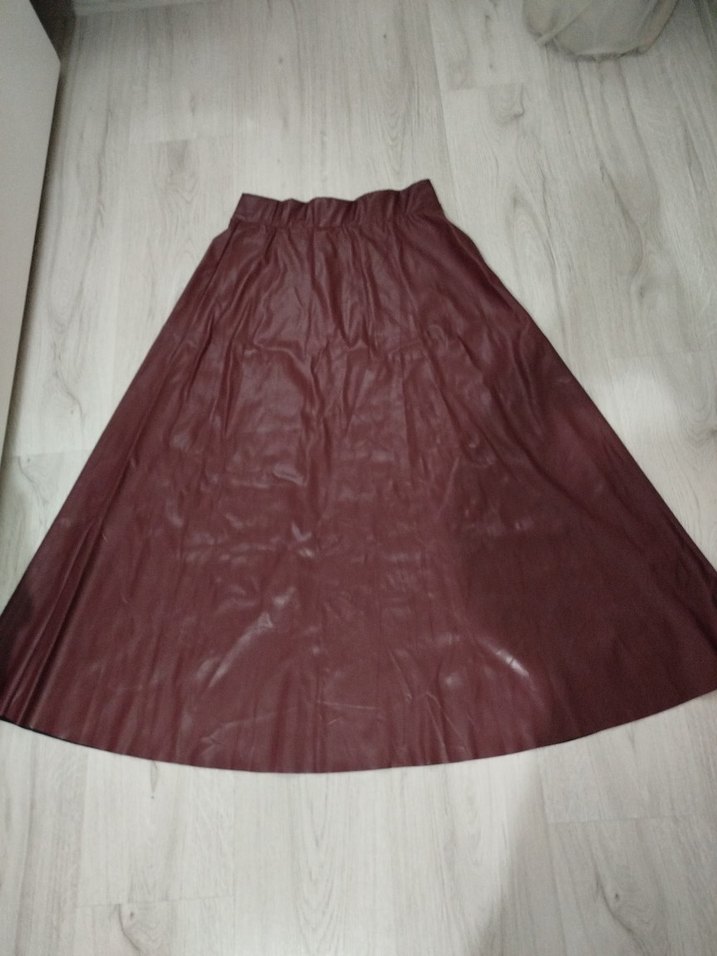 Mürdüm renkli, sentetik kumaştan yapılmış, pileli ve bol kesim uzun kadın eteği, günlük kullanım için uygundur.