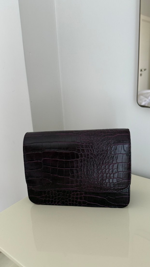Mürdüm deri, yılan deseni ve tokalı detaylara sahip kadın çantası, hiç kullanılmadı.