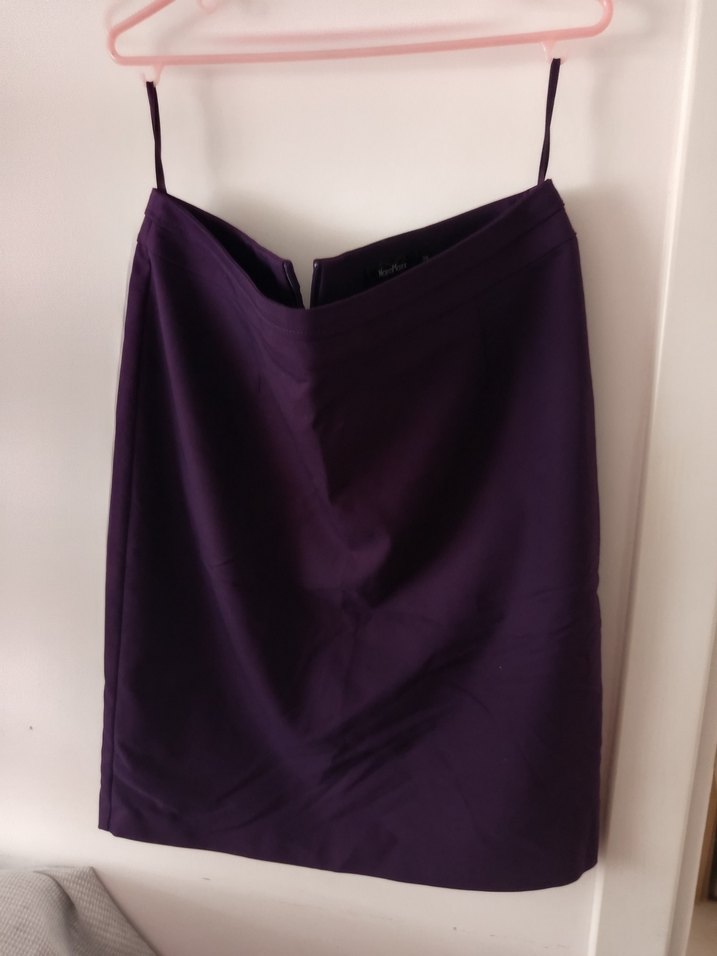 Bu dar kesim eteği, mor kumaş ve drapeli tasarımıyla ofis için minimalist gotik tarz sunar.