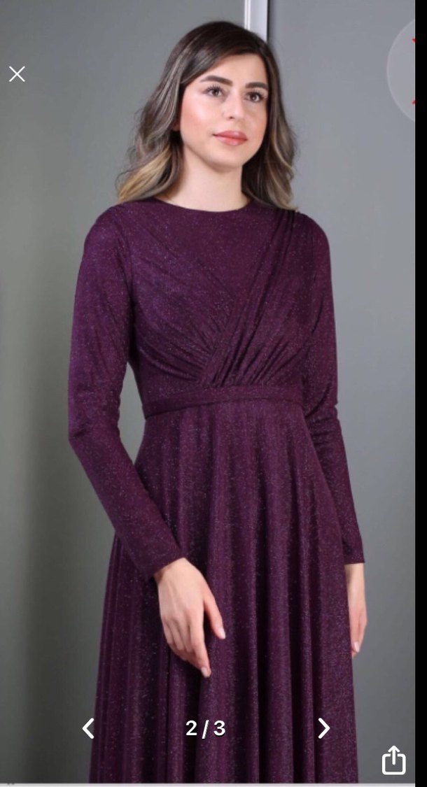 uzun kollu, drapeli tasarıma sahip mürdüm rengi, fitted uzun abiye elbise. Düğünler için klasik ve gösterişli bir tercih.
