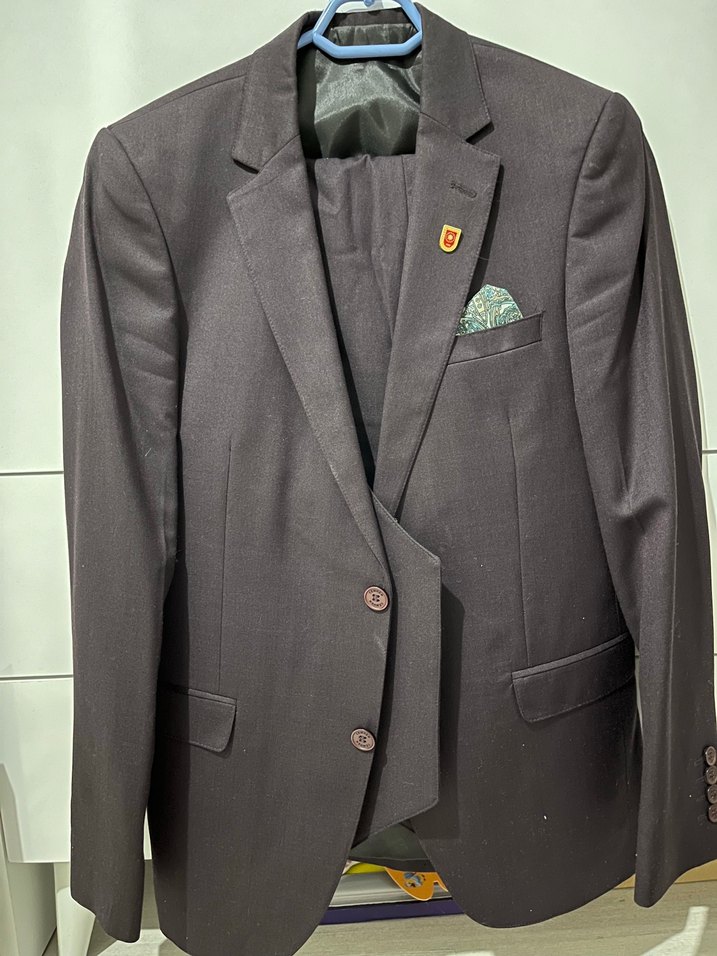 Mürdüm renkte, düğmeli, klasik kesim ve normal midi uzunlukta erkek takım elbisesi. Notch yaka ve uzun kolludur, klasik şıklık sunar. Sadece 1 kez giyildi eşimin boyu 1.70