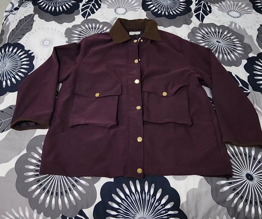 Mürdüm gold düğmeli, yakalı ve uzun kollu midi boy bol kesim ceket. Çift büyük cep detayıyla günlük kullanıma uygun. Sadece birkaç kere kullanıldı. Tertemiz yepyeni.
