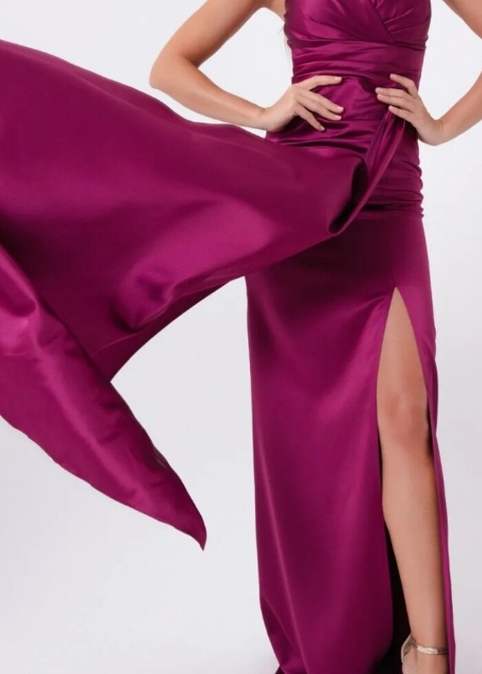 Mürdüm rengi(gerçekte mor gibi) ince askılı hafif dekolteli yırtmaçlı uzun saten kumaş abiye elbise