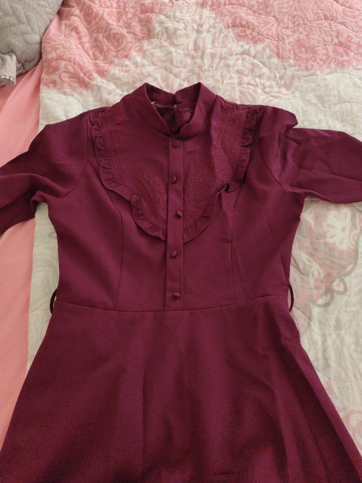 mürdüm renk, uzun kollu, yakalı ve nakışlı fırfır detaylı midi elbise. İnce kesimi ve ipeksi dokusuyla vintage goth tarzını yansıtır, ofis için uygundur.