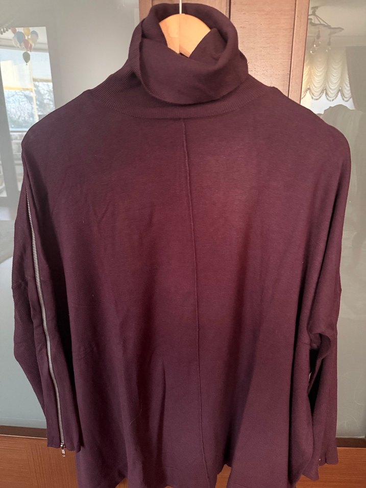Mürdüm renkte, boğazlı ve uzun kollu kadın kazak. Yumuşak ve sıcak kumaştan, bol kesim ve salaş tarzda, günlük kullanıma uygun rahat bir model. Kolları fermuar detaylı çok rahat tunik kazak m beden ama xl bedene bile uyumlu