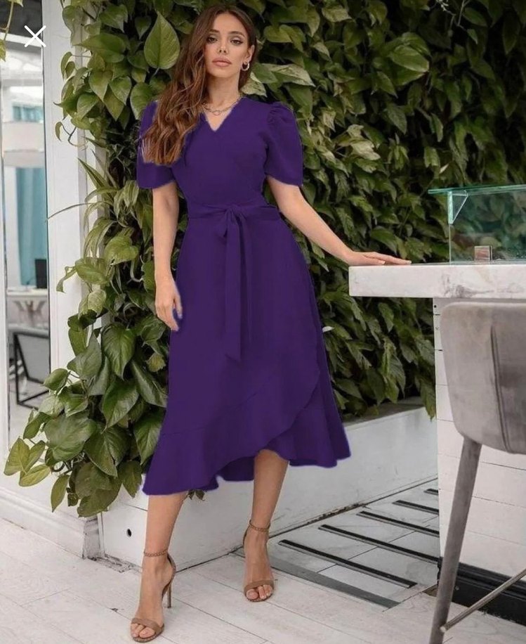 Mürdüm Kısa Kollu Midi Elbise Krep Kumaş
