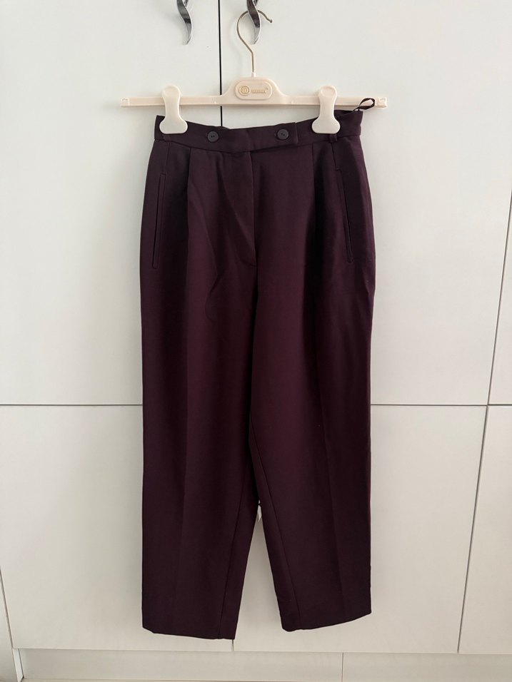 Koyu mürdüm renk pantolon hiç giyilmedi bedeni dar geldiği için bel ölçüsü 32 cm, içine sığmak için bel arka kısmını kestim fotoda mevcut fakat yine olmayınca çareyi satmakta buldum fiyatı uygun tuttum bu yüzden çok kaliteli kumaşı vardır alana hayırlı olsun