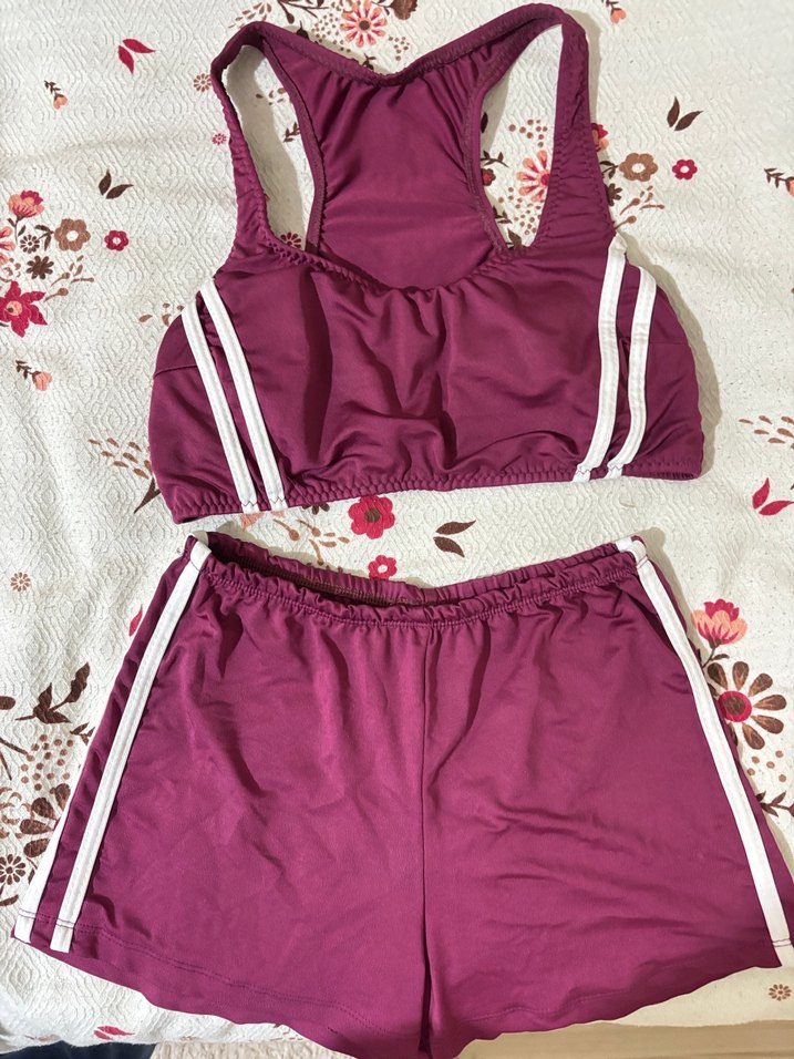 Nürdüm renkli, kolsuz ve fitted üst ile beyaz yan şeritli mini şortlu kadın mayo takımı. Spor ve streetwear tarzına uygun. ♀️
