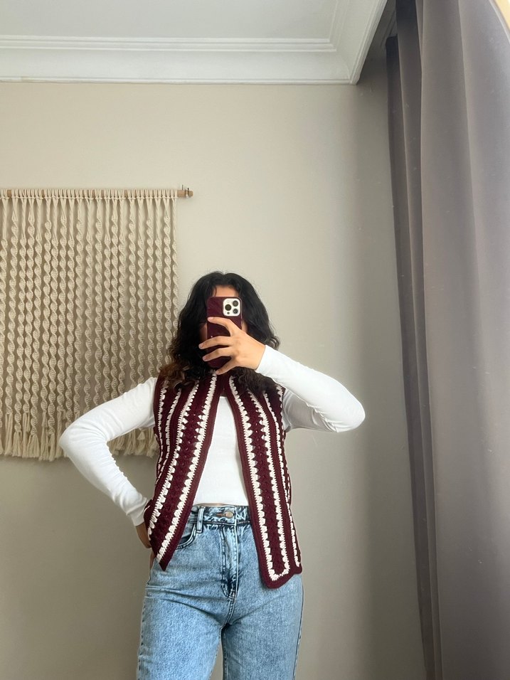 Mürdüm renkli, örgü kumaştan yapılmış, yüksek yakalı ve bol kesimli kadın süveter. Bağcıklı desenli, midi boy ve günlük kullanıma uygun.