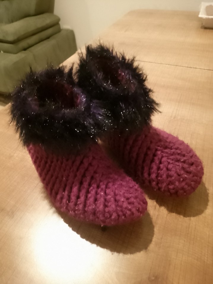 mürdüm renkli örgü kız çocuk ev terlikleri, yumuşak ve sıcak dokusuyla siyah tüylü detaylar içerir, ayakları sıcak tutar.