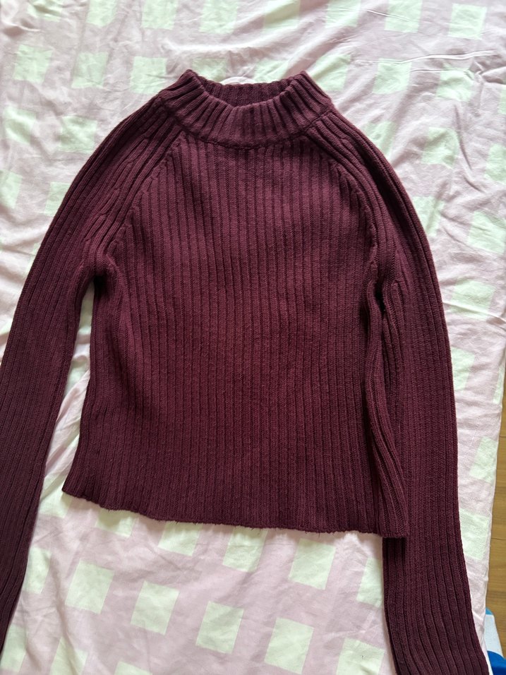 Mürdüm renkli, boğazlı ve uzun kollu, örme dokulu bu fitted kazak, rahat ve sade tarzıyla günlük kullanım için uygundur.