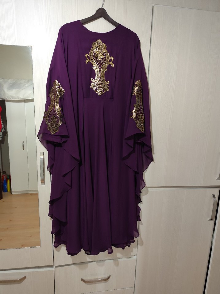 Yarasa Kol Dantel Detaylı Dökümlü Özel Gün ElbisesiHarika bir mürdüm tonunda, hem asil hem de çok rahat bir parça Model: Vücut hatlarını belli etmeyen, dökümlü ve zarif kesim. Yarasa kol tasarımıyla hareket özgürlüğü sağlar. Detaylar: Göğüs ve kol kısımlarında çok şık, dökülme yapmayan altın rengi nakış/aplike detayları bulunmaktadır. Kumaş: Hafif, terletmeyen ve akışkan şifon/krep dokulu kumaş. İç göstermez astarlı tok yapıda Durum: Sadece 1 kez özel bir davette giyildi, tertemiz, hiçbir defosu yoktur. Kullanım Alanları: Kına geceleri, nişan, düğün, mevlid veya şık akşam davetleri için mükemmel bir seçimdir. #mürdümabiye #kaftanelbise #yarasakol #özelgün #abiye #tesettürgiyim #işlemelielbise #düğünkombini #şıkelbise