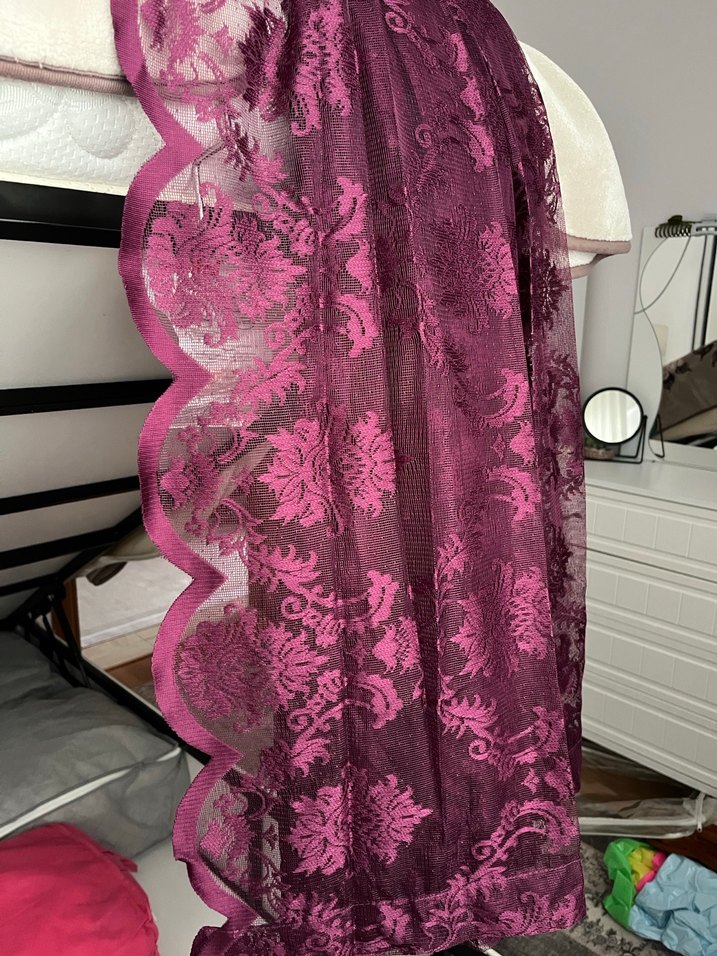 Mürdüm renkli, koyu tonlarda, desenli bohem tarzı tül perde. İnce kumaş, detaylı desenler ve dalgalı kenarlarla süslenmiştir. Çift kanat mevcut