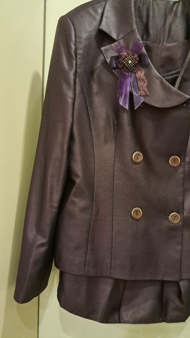 Kahverengi, düğmeli, saten görünümlü kadın takım elbisesi. Normal uzunlukta, klasik elegan goth tarzında, ofis için uygun.