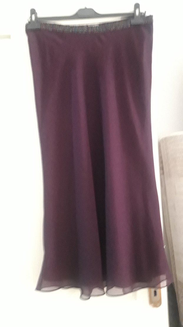 Mürdüm rengi üstü şifon tül astarlı verev kesim moda etek beli boncuk islemeli ince ve şık dokusuyla romantik akşamlar için uygundur.