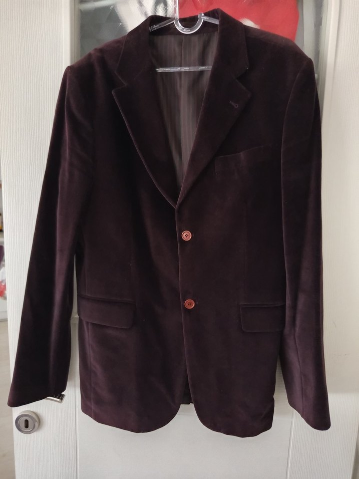 Kadife mürdüm rengi düğmeli, normal uzunlukta erkek ofis takımı ceket, keskin yakalı ve uzun kolludur.