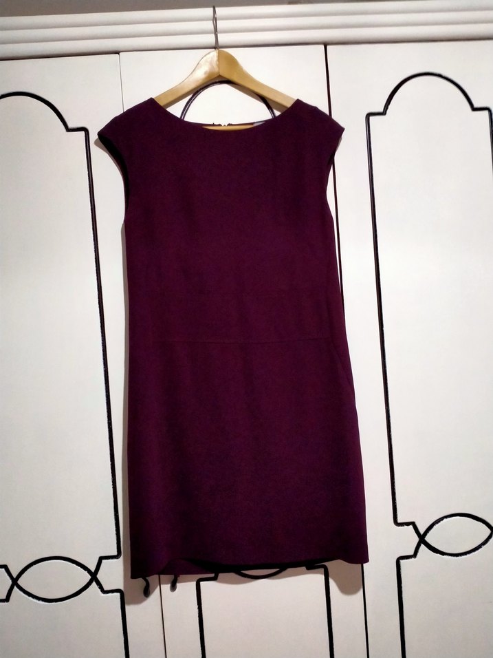 Mürdüm renkte, kolsuz midi elbise. Silky dokulu, fitted kesim ve drapeli detaylara sahip. Ofis için uygun, yuvarlak yakalı elbise.