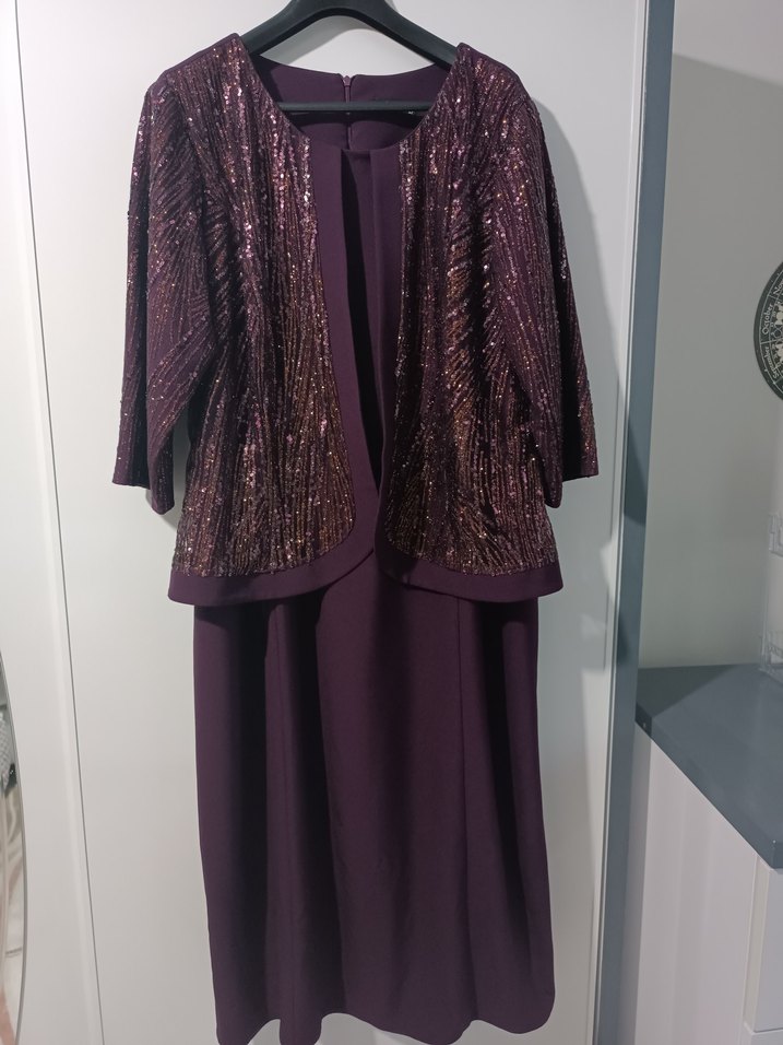 1 defa giyildi mürdüm renk 52 Beden düğün davet için şık bir elbise.Sade elbise tek parça üzerine pul payetli yarım kol ceket görünümü verilmiş.İçi astarlı,arkası fermuarlı giyip çıkarması rahattır. Ölçüleri ➡️ Omuzdan aşağı boy ➡️ 116 cm İki koltuk altı arası en ➡️ 57 cm Kol boyu ➡️ 41 cm