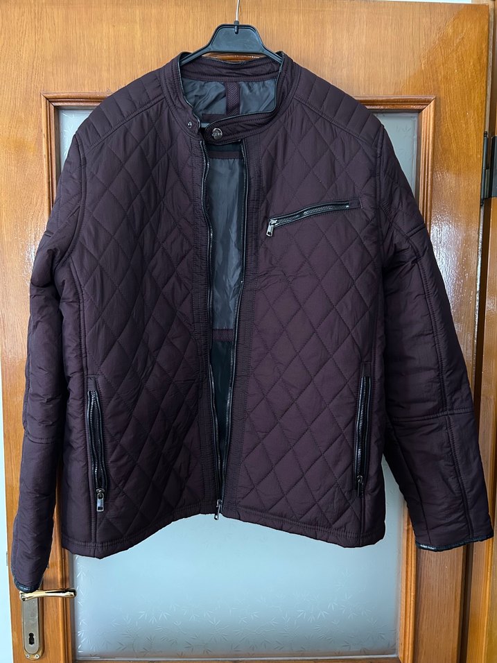 Bu koyu mor biker mont, notched yaka ve uzun kollu, regular fit kesimdedir. Fermuarlı cepleri ve ön fermuarı vardır, sentetik kumaştan yapılmıştır.