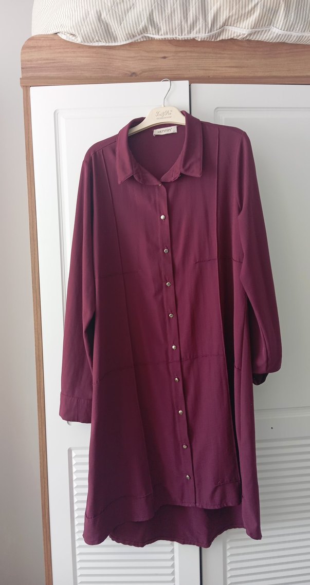 mürdüm renkli kadın tunik, düğmeli ön kısım, uzun kollu ve kesik yaka detayına sahiptir. Rahat kesim ve midi boyda, ipeksi kumaştan üretilmiştir, günlük kullanıma uygundur. asimetrik kesim