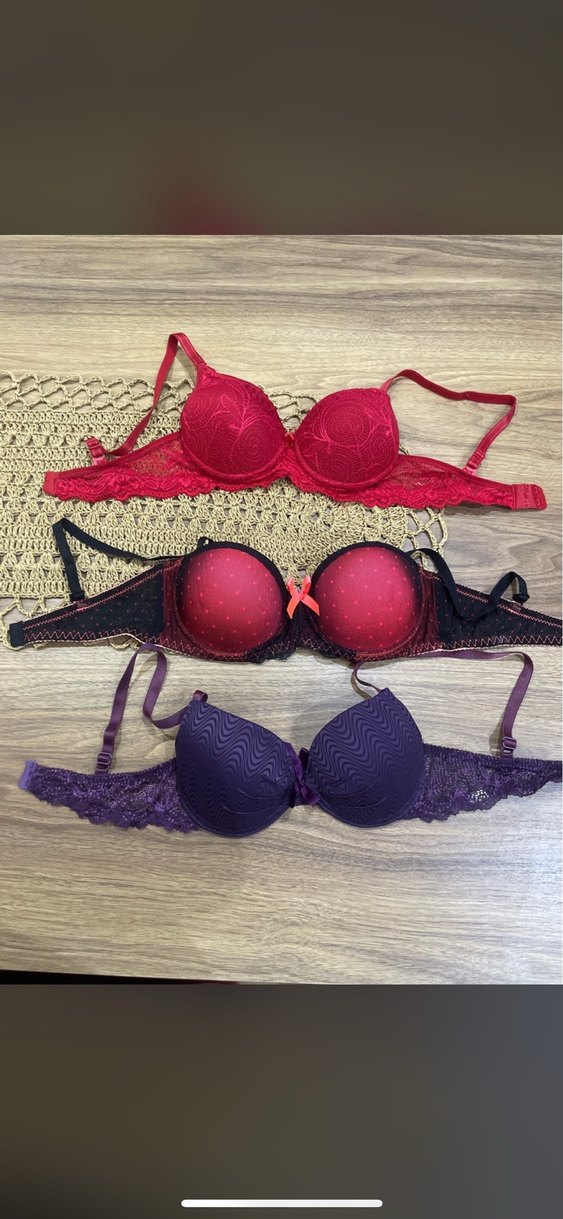 Mürdüm, kırmızı ve nar çiçeği renkli, hepsi 75B beden destekli penti marka sütyen. Hiç bir sorunu yoktur. Resimlerden de anlaşıldığı gibi çok az kullanıldı. Özellikle kırmızı olan sadece 1 kez kullanıldı. Hediye geldi küçük olduğu için bidaha giymedim. Nar çiçeği ve mürdüm olan 3 kez falan giyildi. Ayarlanabilir askılar ve yanlarda dantel detayları bulunur. 1 tanesi 100 tl