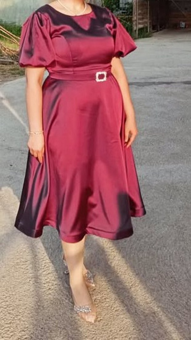 Mürdüm renkli midi elbise, tekne yaka, kısa kabarık kollu ve kemerli. Bol kesim ve parlak dokusu ile düğün nişan söz şıklığı sunar. 1 kez giyidi ön kısmında ip çekilmesi var son görselde mevcut