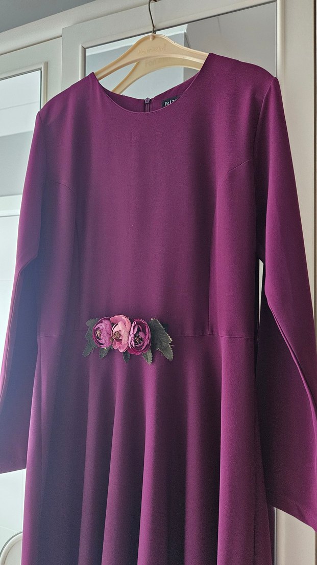 Mürdüm rengi uzun kollu, belden oturan elbise. Yuvarlak yaka, belde çiçek işlemeleriyle vintage ve modern klasik tarzı yansıtır.