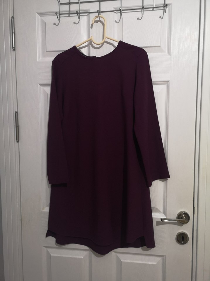 Mürdüm renkli, uzun kollu, salaş kesim midi tunik. İpek gibi yumuşak kumaştan, drapeli ve gündelik kullanıma uygun minimal tasarım.