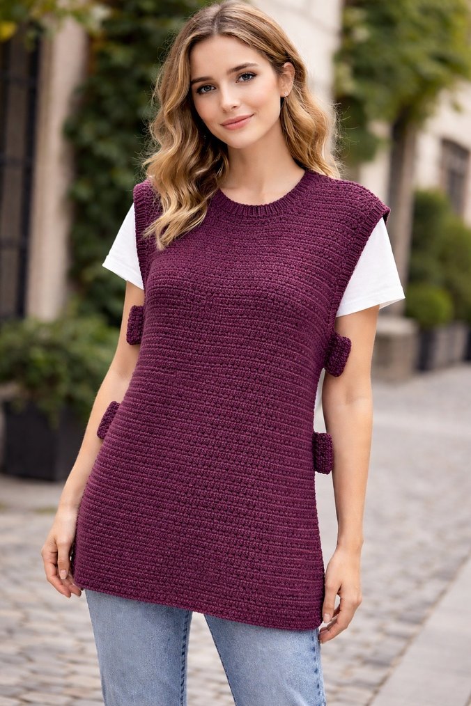 Bordo renkli, yuvarlak yaka, örgü dokulu, salaş kesim ve kolsuz kadın süveter. Günlük kullanım için uygundur, rahat ve şık bir görünüm sunar.