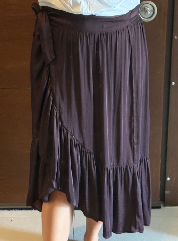 Mürdüm midi boy, bol kesim, fırfırlı ve ipeksi dokulu bohem tarzda kadın eteği. Günlük kullanım için uygundur.