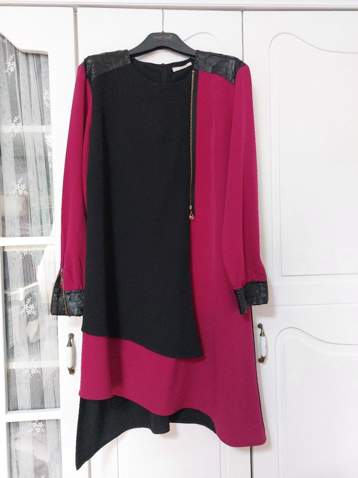 Mürdüm ve siyah renklerde, uzun kollu, tesettür tunik. Eflin marka 5 beden, 44-46 beden aralığında giyilebilir. Rengi telefonum iyi çekmedi. Son fotoğrafı renk açısından fikir vermesi açısından koydum, esasen o renkte. 2-3 kere giyildi. Herhangi bir deformesi yok. Kilo aldığım için giyemiyorum. Sorularınızı yanıtlayabilirim.
