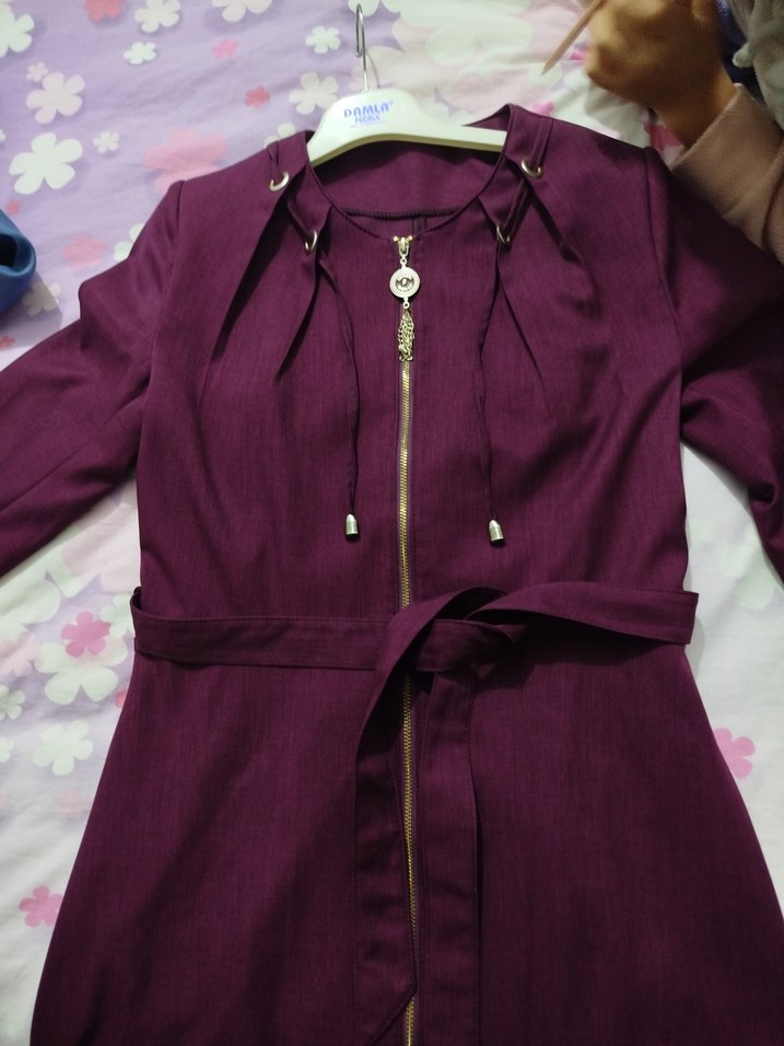 mürdüm renkli, fermuarlı, uzun ve beli kuşaklıdır. Notlu yakası ve uzun kolları ile şık ve parlak mevsimlik kumaştan üretilmiştir.