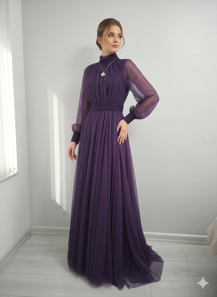 Mürdüm renkte, yüksek yakalı ve drapeli tasarıma sahip uzun kollu, bol kesim abiye elbise. Düğünler için uygun. ✨