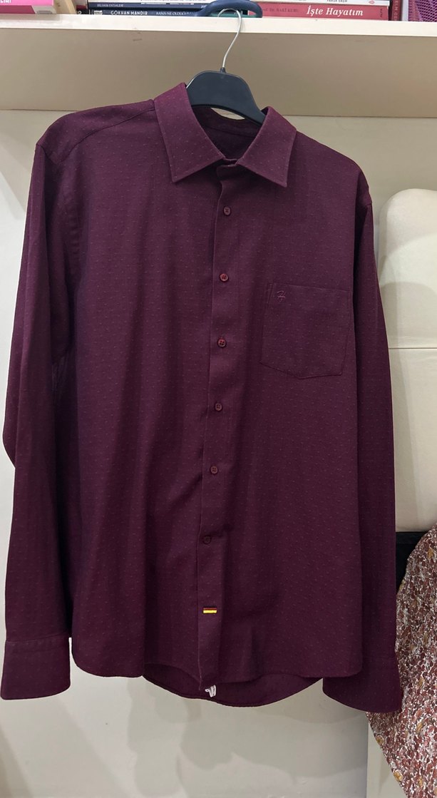 Mürdüm renkli erkek gömlek, uzun kollu ve düğmeli. Sentetik kumaştan üretilmiş, normal kesim ve yakasında çentikli detay bulunur. Ofis ve günlük kullanım için uygundur.