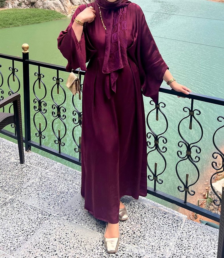 Mürdüm renkte, uzun kollu ve bu uzun elbise, salaş kesimiyle rahat bir kullanım sunar. İpek gibi kumaştan üretilmiş, drapeli ve işlemeli detaylara sahip, mütevazı bohem tarzını yansıtır. Günlük kullanıma uygundur.