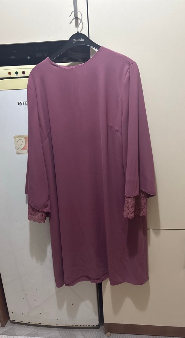 Mürdüm renk, uzun kollu, salaş kesim ve dökümlü tasarıma sahip, ipeksi kumaştan üretilmiş tunik. Yuvarlak yaka ve dantel detaylı manşetler içerir. Marka: ESTE.