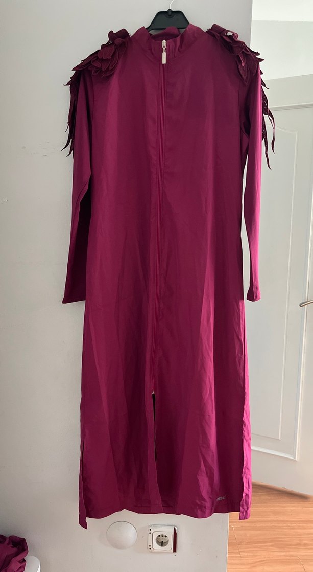 Mürdüm renk, uzun kollu, s beden tesettür haşema. Hiç giyilmedi etiketi üstünde takım halinde satılmaktadır.