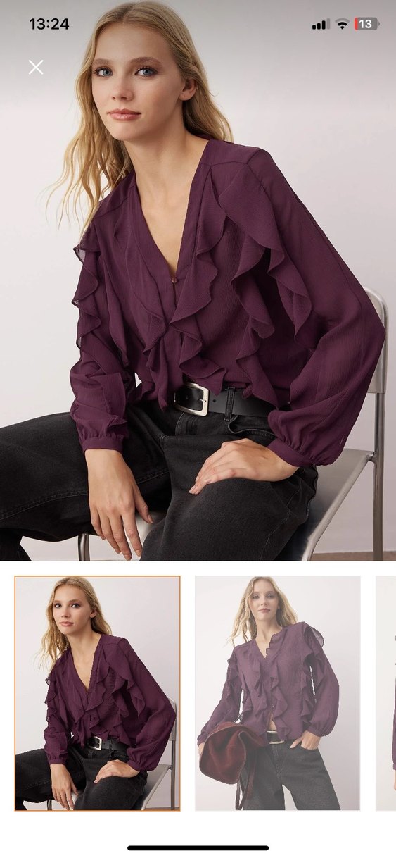 Mürdüm V Yaka Fırfırlı Kadın Bluz
