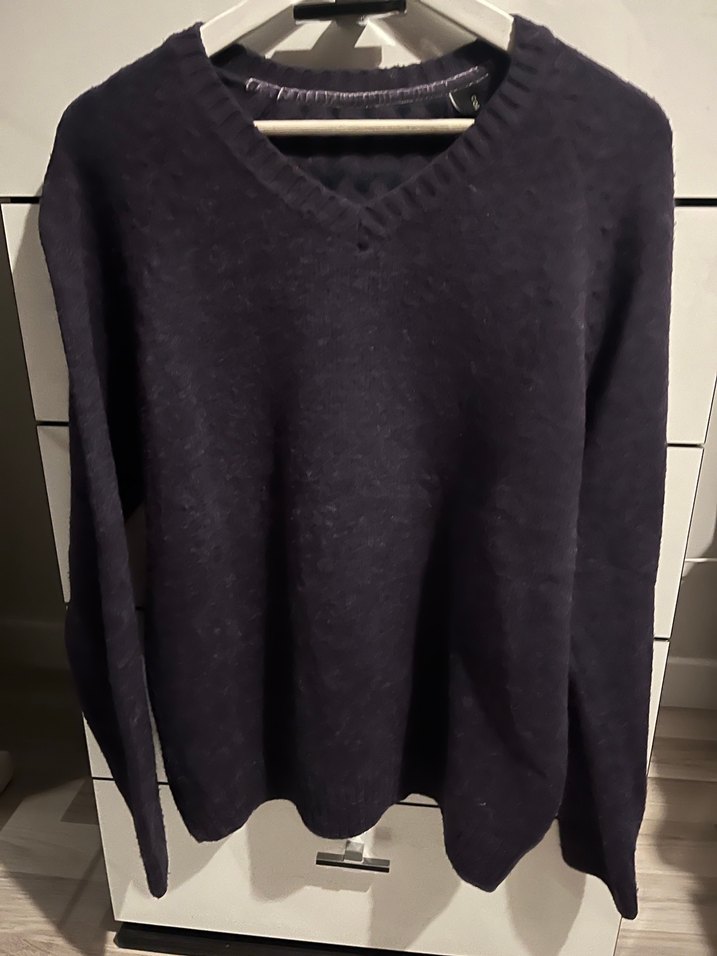 Murdum renk, V yakalı ve uzun kollu erkek triko kazak. Yün örme kumaştan, bol kesim ve rahat günlük kullanım için uygundur.