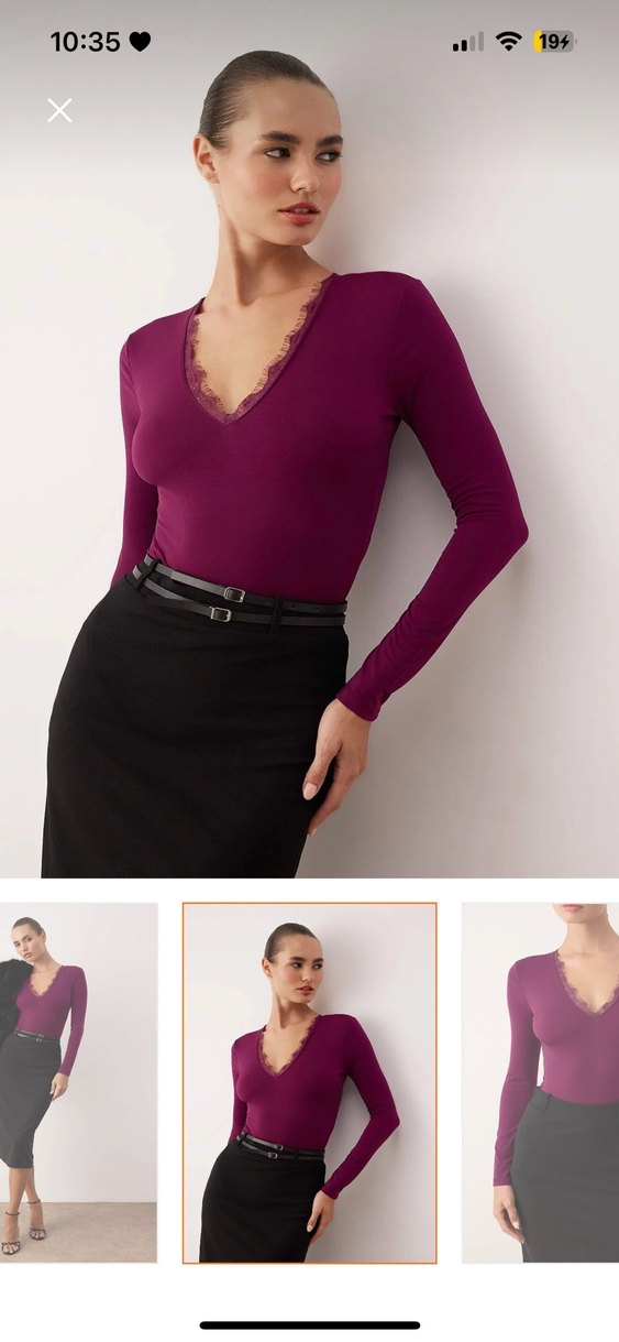 Mürdüm renkli, v yakalı ve dantel detaylı, uzun kollu, kemerli, saten dokulu, ofis için uygun kadın bluz. Etiketi koptu ama hiç giymedim tertemiz dekoltesi derin göğüslerim küçük olduğu için bana yakışmadı