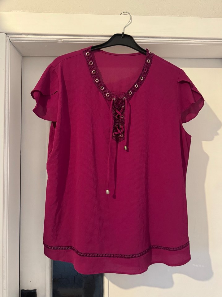 Mürdüm renkli, V yakalı, düğmeli ve parlak nakış detaylı, kısa kollu, bol kesim, ipeksi kumaştan günlük kullanıma uygun kadın bluz.