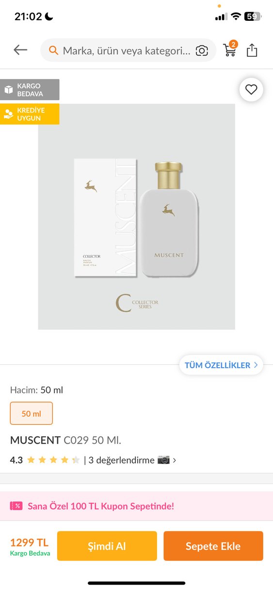 Muscent kadın parfümü, 50 ml hacimde, beyaz ve altın detaylı sade şişede sunuluyor. 3 değerlendirme ile 4.3 puana sahip. Sıfır kutulu jelatini bile açılmadı.