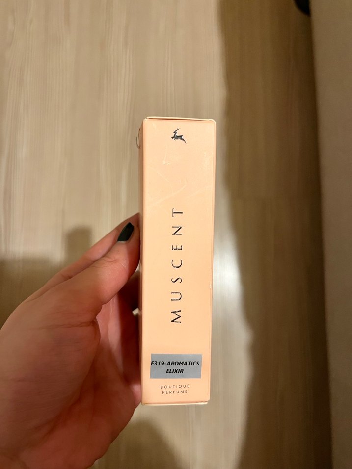 Muscent F319 Aromatics Elixir, boutique kadın parfümü olarak zarif bir koku sunar. Ambalajı aromatik özelliğini vurgular.