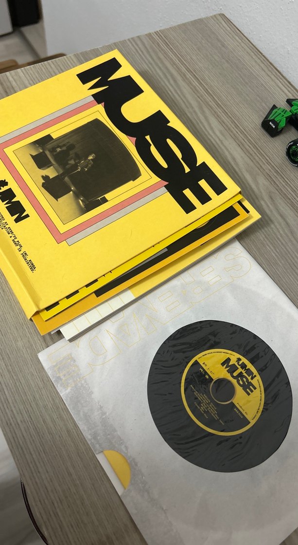 Muse'un sarı kapaklı plak albümü, siyah-sarı etiketli plak ve koruyucu kılıflarla birlikte.