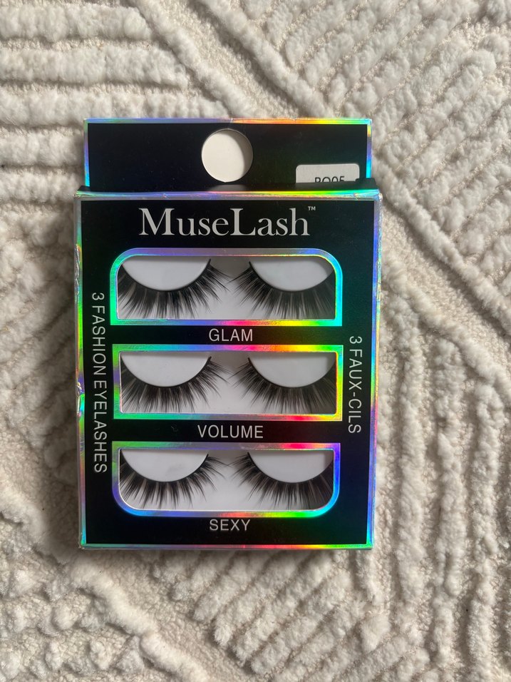MuseLash markalı, farklı görünüm seçenekleri sunan 3 çift çok renkli koyu takma kirpik paketi.