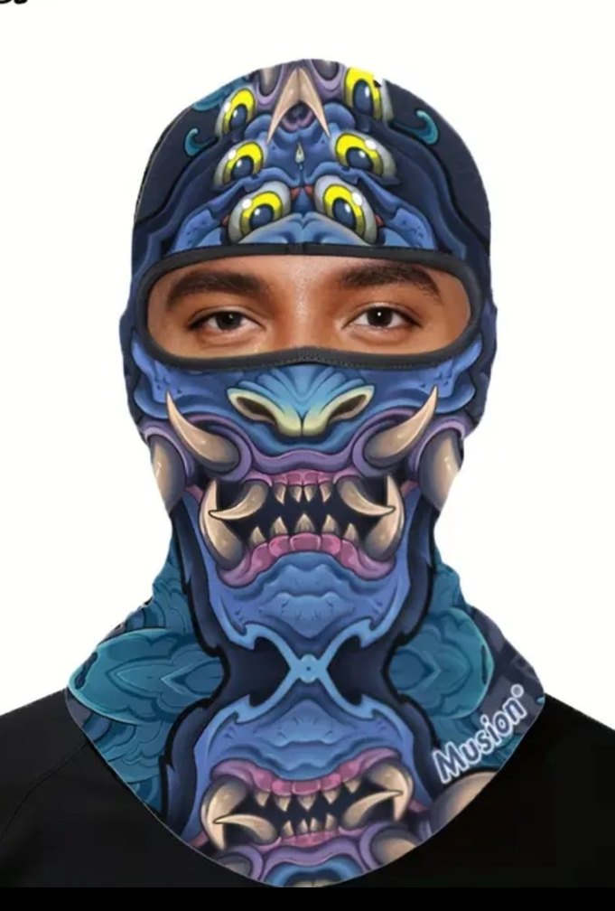 Koyu mavi, avant-garde desenli erkek beanie, cesur sanat öğeleri ve 'Musion' logosu ile. kar maskesi