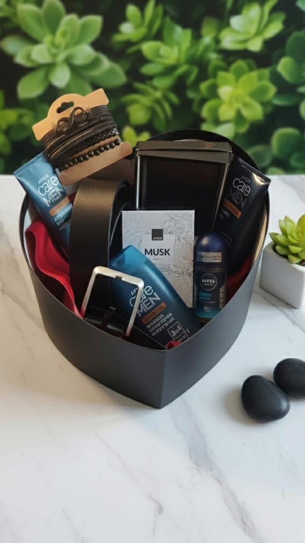 Musk kokulu duş jeli, deodorant ve tıraş sonrası losyon içeren erkek bakım seti, kemer ve bilekliklerle siyah kalp kutusunda sunuluyor.